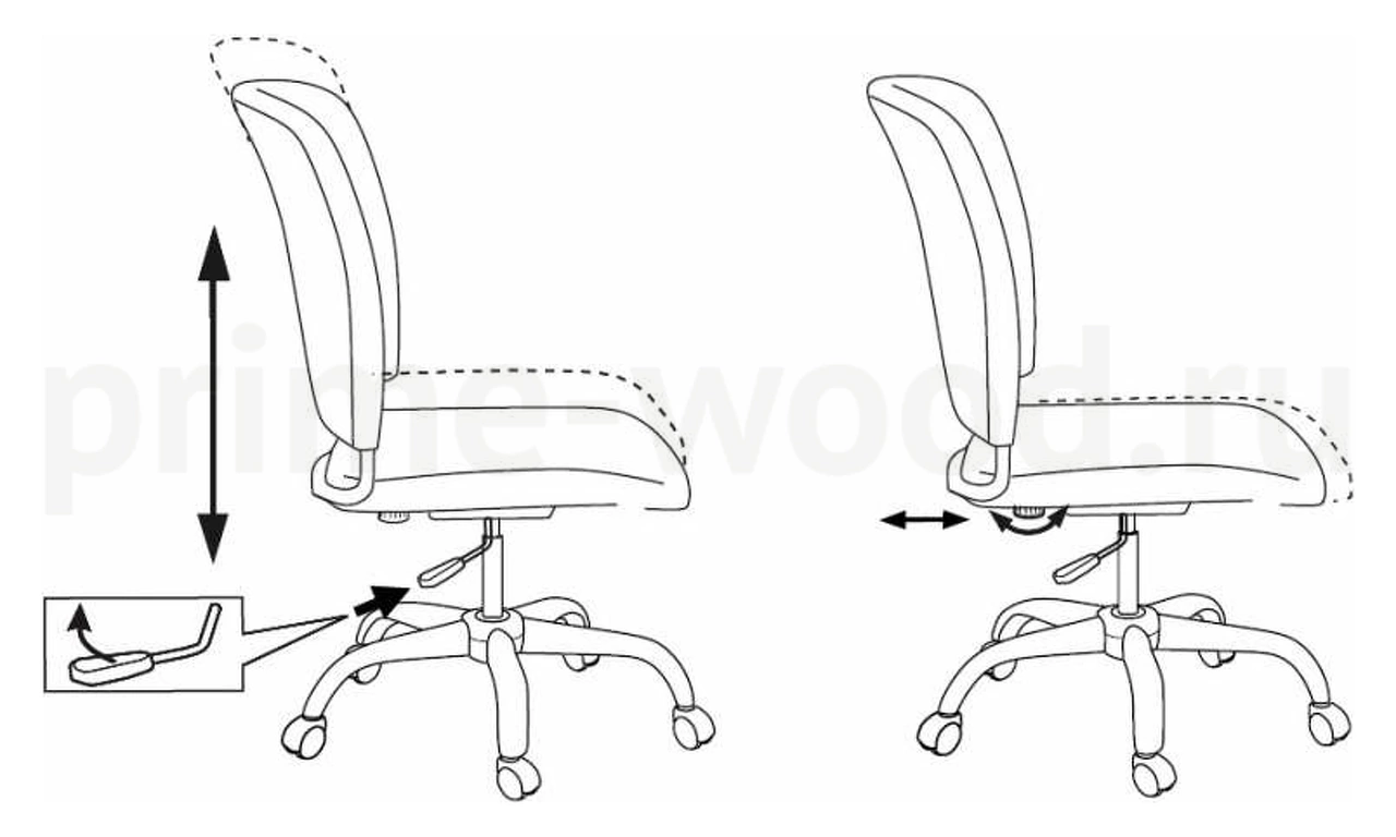 Глубина сиденья регулируется за счет перемещения спинки вместе с опорой взад-вперед с помощью барашка